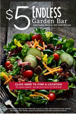 Ruby tuesday salad bar coupon. RUBY TUESDAY - 52 Photos & 41 Reviews - Yelp Specialties: Ruby Tuesday is casual dining at its finest! Handcrafted burgers, fall-off-the bone ribs, our famous Garden Bar with more than 55 salad toppings, and many more options for the foodie in your life. Happy Hour from 4-6pm and 9-Close, every day (where allowed by law). Inflation-busting daily deals @ Ruby Tuesday! - Ruby Tuesday Save on lunch & dinner with specials every day of the week. $5.99 Cheeseburgers, $6.99 Garden Bar, $11.99 Ribs, and a new deep cut deal every Thursday! Extra 25% Off Ruby Tuesday Coupons & Specials | Sep 2022 Ruby Tuesday Coupons and Promo Codes for September Offer Verified!8 Used Today Get Offer 15% off Sale AAA Members: 15% Off Your Order w/ Verification Offer Verified!4 Used Today Get Offer $5 off Sale Sign Up to the So Connected Club For $5 Off Order + Extra Perks Offer Verified!1 Used Today Get Offer SALE Sale Ruby Tuesday - Good Every Day + Coupon - How Was Your Day? And who can forget about the amazing Ruby Tuesday Garden Bar? I mean, Ruby Tuesday is pretty much famous for it. There are not a whole lot of places that serve baby spring greens, let alone have them on their salad bar. Factor in all the other topping options, and you're in salad heaven. Pair the Garden Bar with something like Baja Chicken ...